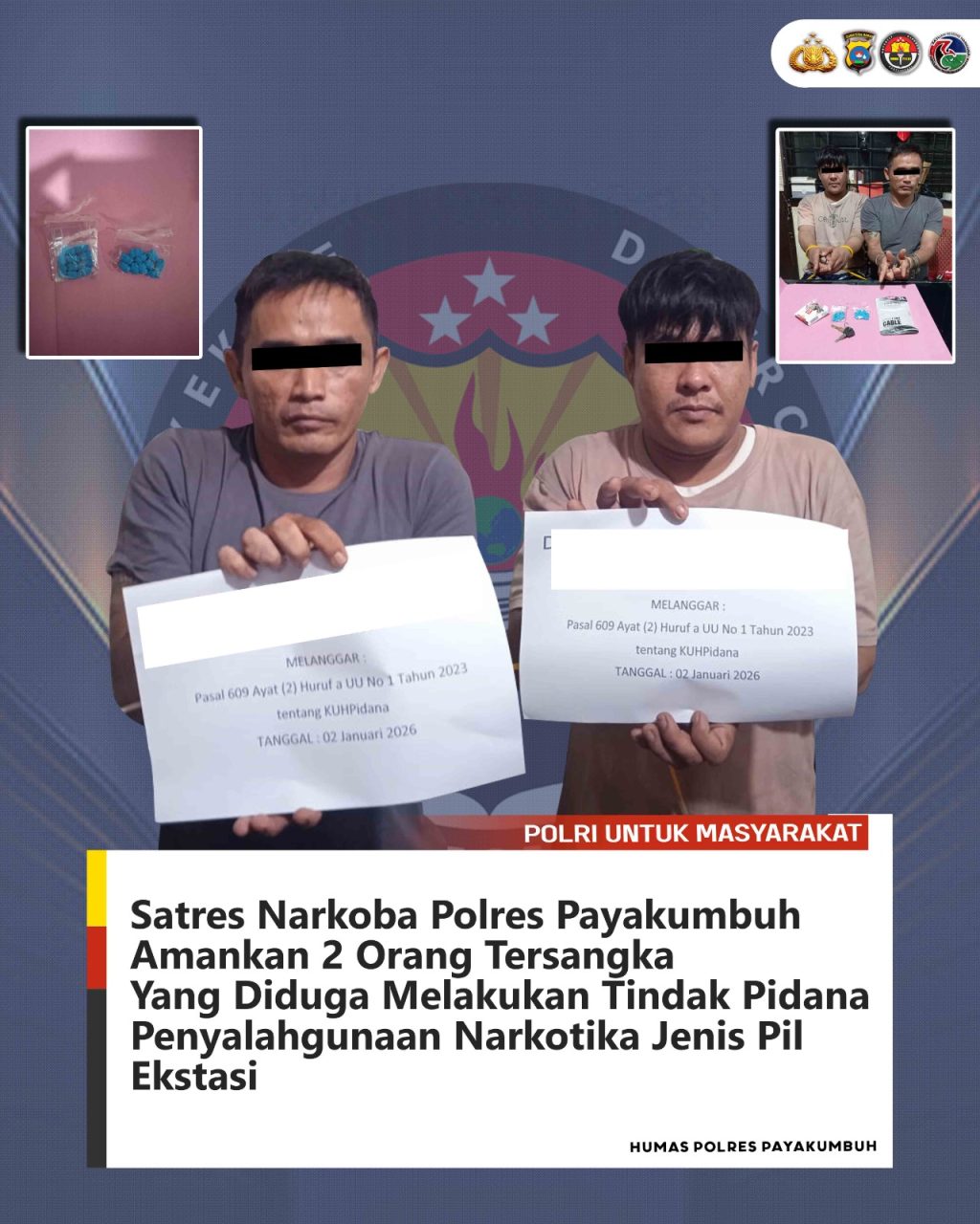 Kapolres Payakumbuh AKBP Ricky Ricardo, S.I.K.S.H.M.H melalui Kasat Narkoba AKP Hendra, S.H.M.H saat dikonfirmasi menjelaskan, dua orang tersangka yang ditangkap merupakan target operasi jajaranya yang beberapa waktu kebelakang telah dipantau gerak geriknya.